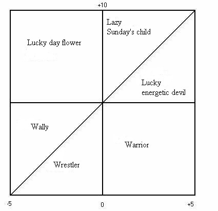 In the lower half of the table we find the people who are unhappy from an objective perspective. To the right are the people who despite all their objective unhappiness nevertheless say that they have enough energy, experience etc. to feel at least happy. They scored more than 0 for their subjective happiness. Even when they do not have a lot of luck in their lives, they can cope with it and try to do something about their objective unhappiness. This kind of person we call a warrior.