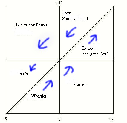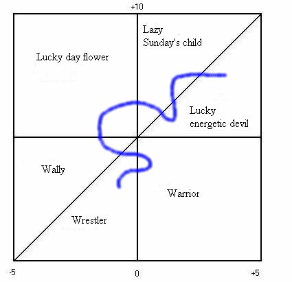 In the graph this is represented by the fact that all arrows to the right of the diagonal are upwards. This means that the future for these people will bring a larger objective happiness. Through their relatively high level of energy, life experience and stability, they might be able to acquire more wealth, social contacts en health. In this way, also their subjective happiness will increase. It is a kind of upward vicious circle. The wrestler will turn into a warrior and the warrior will find himself in the upper half of the graph. At the end everybody will become a lucky energetic devil.